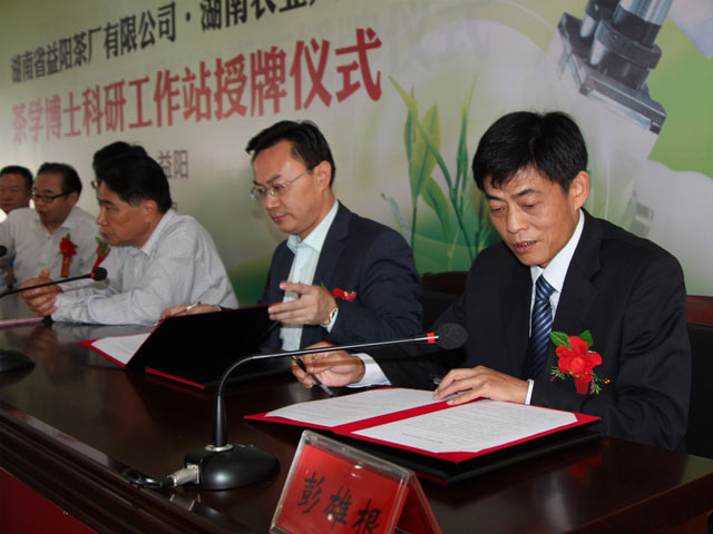 随后,在各级领导、海内外茶学专家以及来宾们的共同见证下,湖南农业大学茶学博士科研工作站首席专家刘仲华教授与益阳茶新葡京app董事长彭雄根先生签署了战略合作协议,并向公司常务副总经理徐迪军先生颁发湖南农业大学茶学博士科研工作站牌匾。