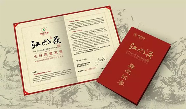 由国家非遗茯砖茶制作技艺代表性传承人——刘杏益亲自监督制作,每套均具有典藏证书,并有刘杏益大师亲笔签名,每套都标有独立典藏编号。全球限量发售,每片都拥有独立的编号,更彰显此款茯茶的尊贵。