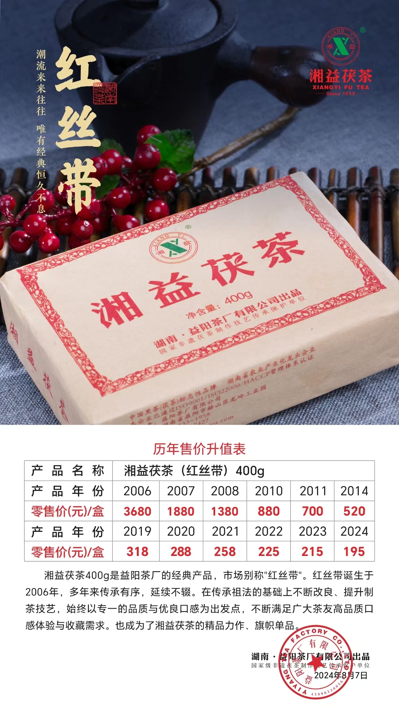 红丝带诞生于2006年,多年来传承有序,延续不辍。它延续的不仅仅只是产品,更是精益求精的品质与口感。湘益茶人在传承祖法的基础上不断改良、提升制茶技艺,始终以独特的品质工艺与优良口感为出发点,不断满足广大茶友高品质口感体验与收藏需求。在制茶匠人数十年如一日的精雕细琢、茶友们日复一日年复一年的口感认证之下,红丝带成为了湘益茯茶的精品力作、旗帜单品。