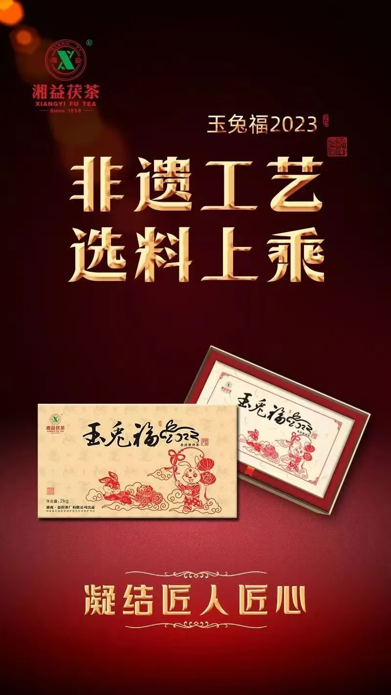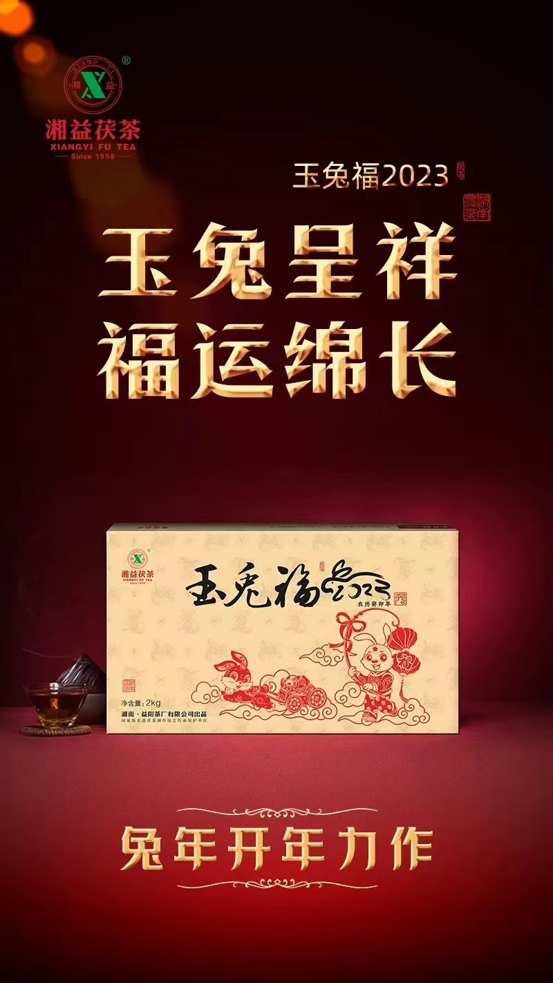 兔,明月之灵,被称为瑞兽,是聪慧善良、家族兴旺的代表,寓意长寿、平安吉祥。“玉兔福2023”以“玉兔呈祥”立意,凝聚新一年的时与运,蕴藏着湘益茯茶对兔年的理解与美好寄望,祈愿兔年大吉、前途似锦、福运绵长。精选雪峰山脉核心产区一级黑毛茶,条索紧结肥壮、嫩度高,内含物质丰富。由国家级非遗茯砖茶制作技艺代表性传承人刘杏益大师结合多年制茶经验、依古法精制而成。非遗技艺结合现代化制茶工艺,塑造了“玉兔福2023”茶香馥郁、层次丰富的特性。