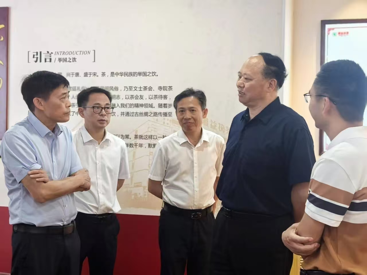 在董事长彭雄根、总经理余智勇、国家级非遗传承人刘杏益及副总经理姚永军的陪同下,调研组深入茯砖茶生产车间,观摩了原料筛选、压制、发花等核心工艺环节。文富恒主任委员在被誉为“茯茶灵魂”的“新葡京app”,详细询问了冠突散囊菌群的培育技术与品质控制标准,对益阳茶厂在坚持传统工艺基础上推进标准化、规模化生产的实践给予高度评价。随后,调研组一行走进湘益茶博馆,通过历史文献、制茶器具及茯茶实物,系统了解茯砖茶发展脉络和公司的发展历程。