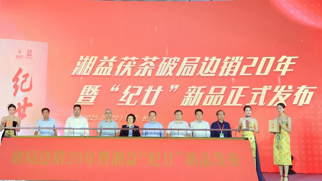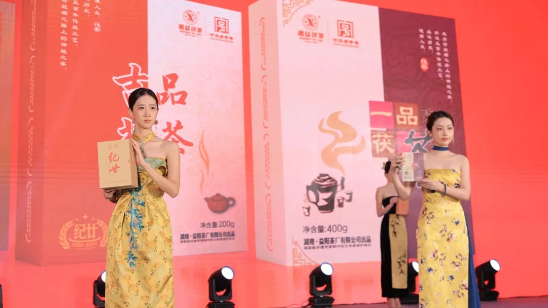在发布仪式上,与会领导和专家共同启动推杆,随着金沙倾泻而下,"纪廿"新品正式亮相,象征着湘益茯茶开启新的发展征程。随后,一场别开生面的新品模特走秀吸引全场目光。身着典雅服饰的模特手捧"纪廿"新品,以优雅的姿态展示这款传承与创新相结合的茯茶珍品,传统茶文化与现代时尚在此完美交融,凸显出新品的独特魅力。