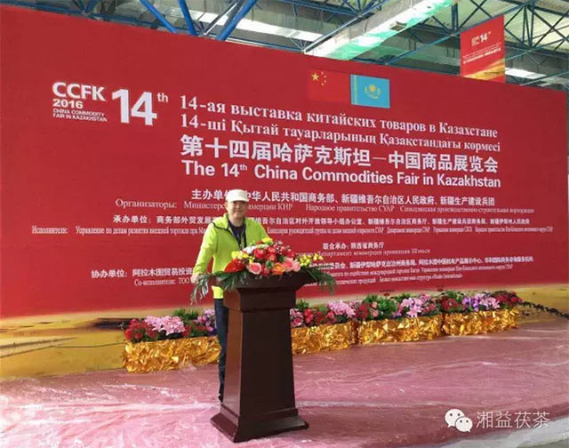 第十四届哈萨克斯坦——中国商品展览会于2016年5月20日在哈萨克斯坦阿拉木图市隆重开幕。为积极落实中央关于加快推进丝绸之路经济带建设,加大企业开拓中亚新兴茶叶市场,提升湘益茯茶在中亚各国的品牌优势,新疆新益茶业有限责任公司做为兵团代表之一向国外客商及消费者展示了湘益牌系列茯砖茶产品并受到一致好评。