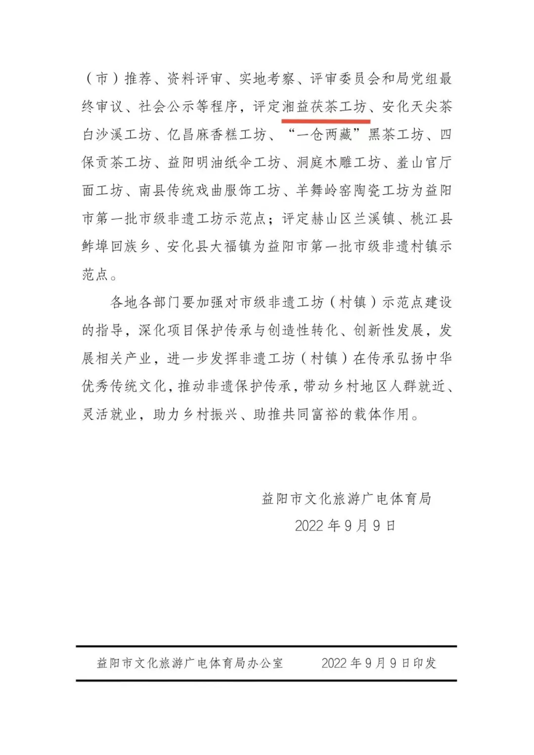 为深入贯彻中共中央办公厅、国务院办公厅《关于进一步加强非物质文化遗产保护工作的意见》有关精神,市文化旅游广电体育局在全市开展非遗工坊、非遗村镇、非遗街区示范点建设工作,经区县(市)推荐、资料评审、实地考察、评审委员会和局党组最终审议、社会公示等程序,评定湘益茯茶工坊、安化天尖茶白沙溪工坊、亿昌麻香糕工坊、“一仓两藏”黑茶工坊、四保贡茶工坊、益阳明油纸伞工坊、洞庭木雕工坊、羞山官厅面工坊、南县传统戏曲服饰工坊、羊舞岭窑陶瓷工坊为益阳市第一批市级非遗工坊示范点;评定赫山区兰溪镇、桃江县鲊埠回族乡、安化县大福镇为益阳市第一批市级非遗村镇示范点。