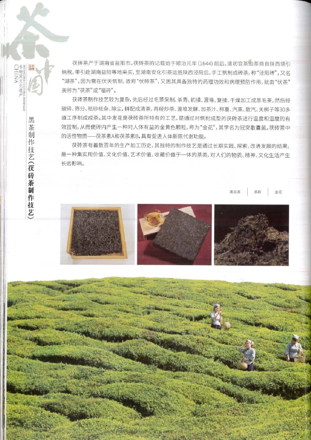 是后发酵茶,又属于全发酵茶。其所含的益生菌-冠突散蘘菌是茯茶必备的独有品质特征。茯砖茶是边销茶的主要品种之一,是西北各名族人民的生活必需品。茯砖茶,唐代以后被官府所控用来茶马交易,亦称府茶、官茶。因茯茶对西北各族人民的重要性又被称之“