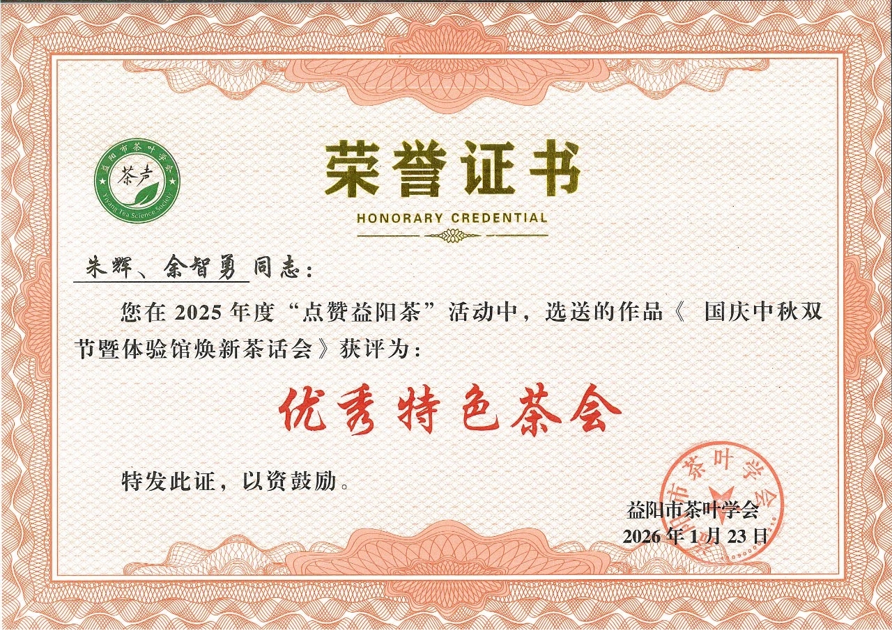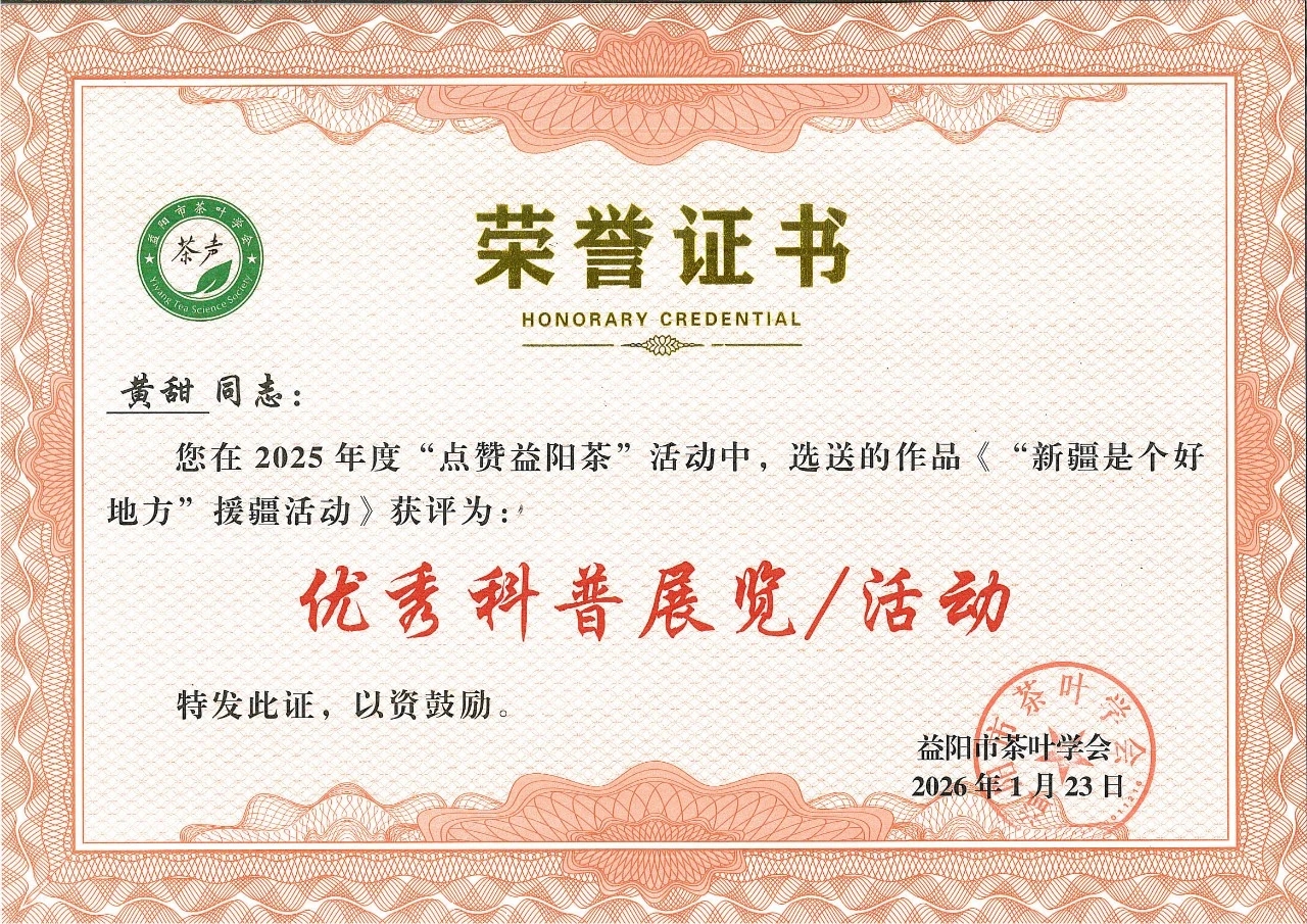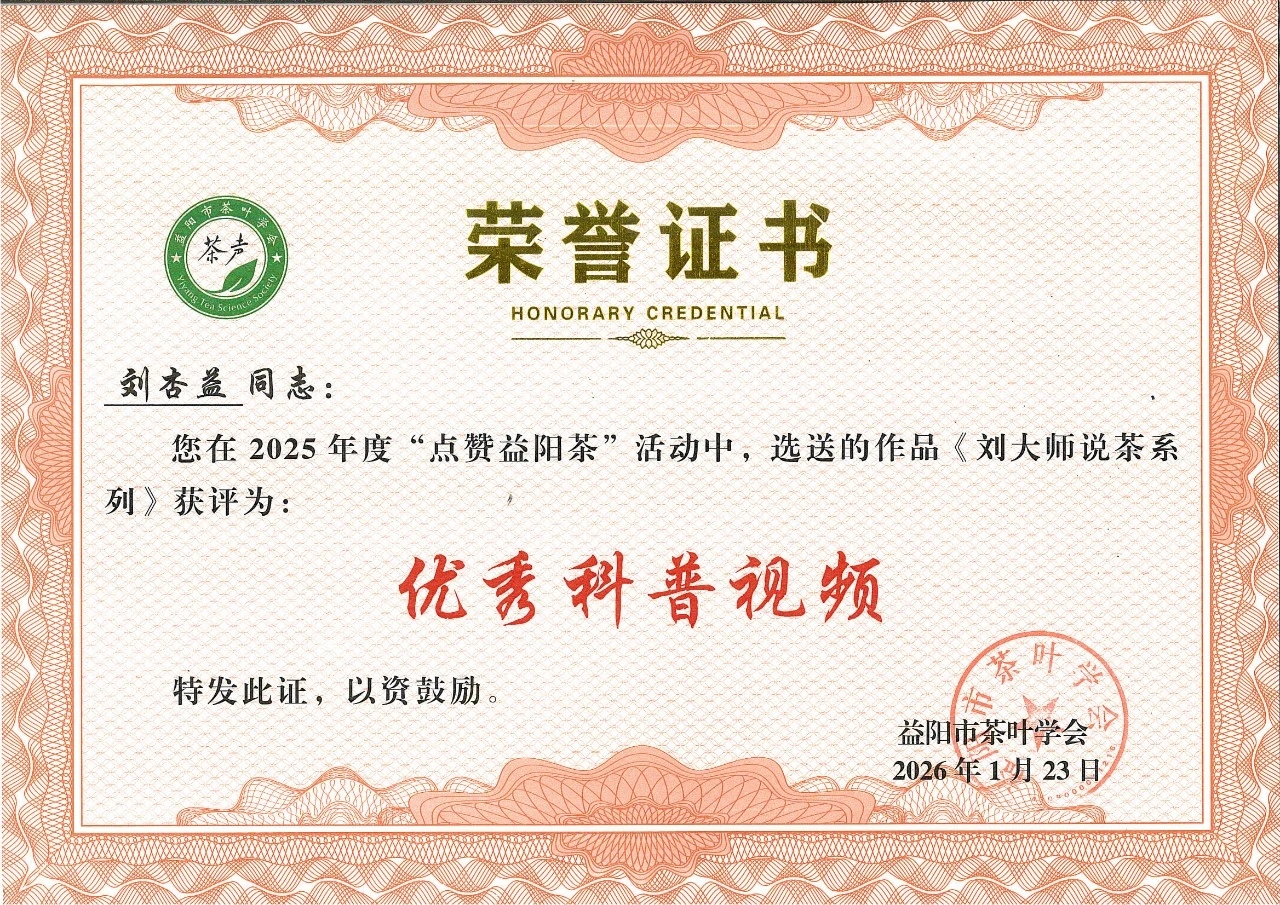 徐迪军主持。会议审议通过了学会年度工作报告、财务报告及人事调整议案,并为新晋理事单位授牌。在隆重的表彰环节,会议宣读了《关于表彰2025年度“点赞益阳茶”优秀成果的决定》。我公司报送的项目成果喜获多项荣誉:朱辉、余智勇同志的《国庆中秋双节暨体验馆焕新茶话会》获评“优秀特色茶会”;刘杏益大师的《刘大师说茶系列》获评“优秀科普短视频”;黄甜同志的《“新疆是个好地方”援疆活动》获评“优秀科普展览/活动”。这些荣誉是对公司长期以来坚持科技创新、文化普及与社会责任实践的高度认可。