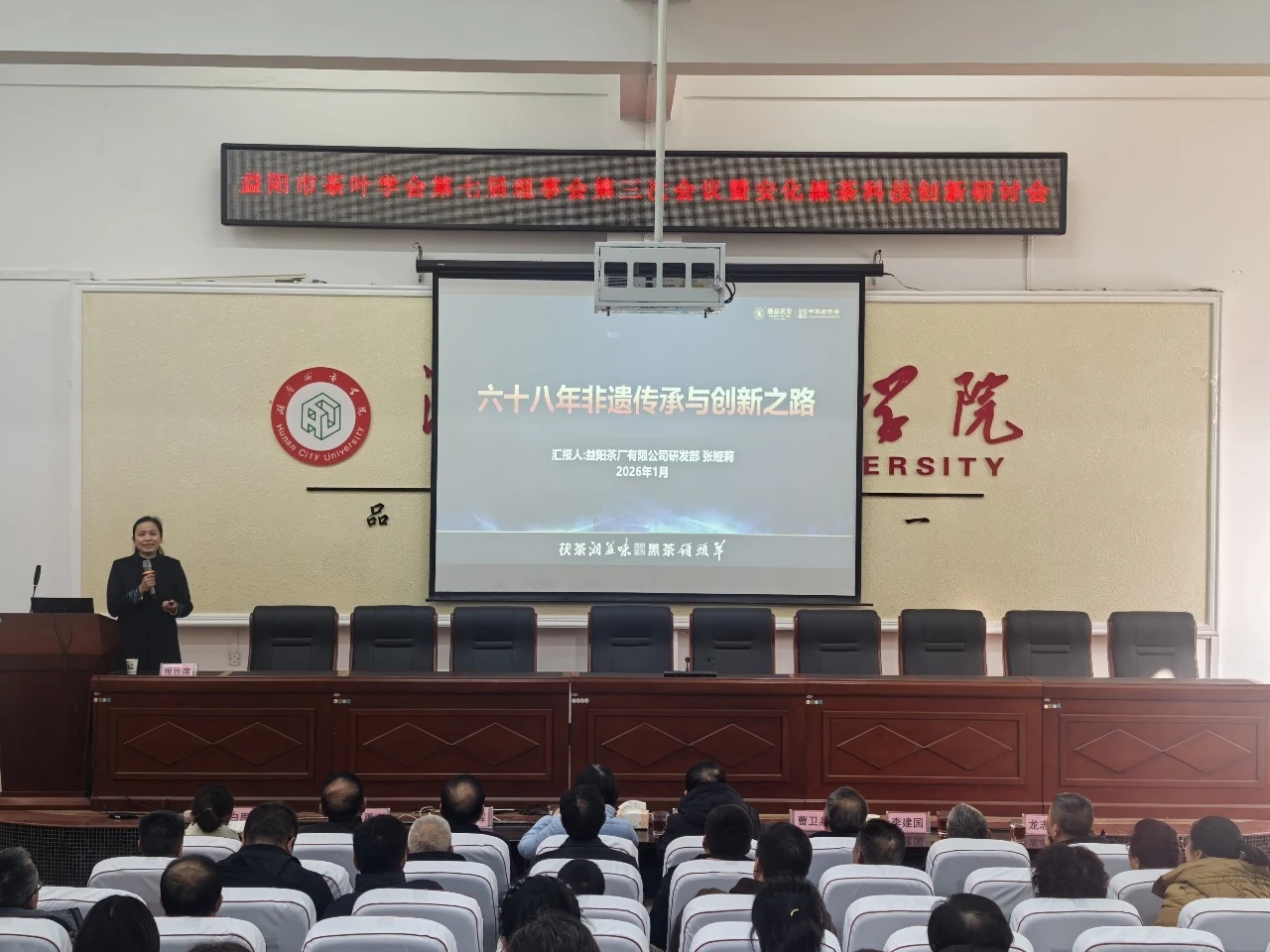 随后举行的安化黑茶科技创新研讨会上,公司产品研发部副经理、中级农艺师张娅莉代表公司,以《益阳茶新葡京app最新:六十八年非遗传承与创新之路》为题,向与会嘉宾分享了我公司的科技创新经验。报告系统梳理了公司自1958年创立以来,在茯砖茶制作技艺这一国家级非物质文化遗产传承保护中所取得的里程碑式突破,并重点介绍了近年来依托传统技艺,融合现代科技,在生产线智能化升级、高嫩原料发花技术攻克、产品形态与品类创新等方面取得的系列成果,展现了我公司作为老字号龙头企业在“三茶统筹”发展道路上的探索与担当。